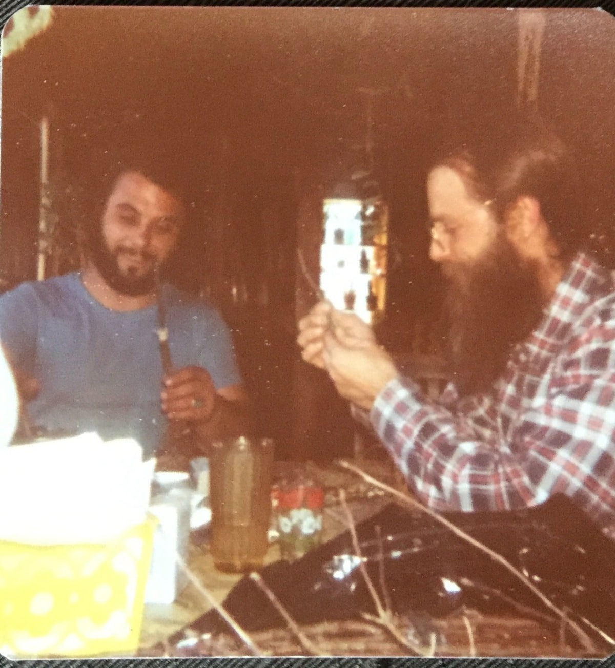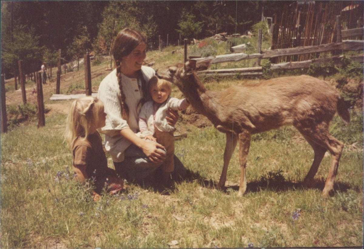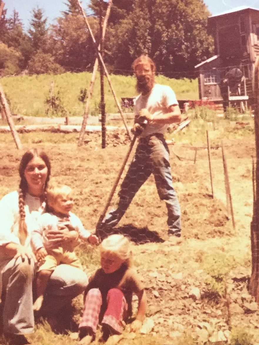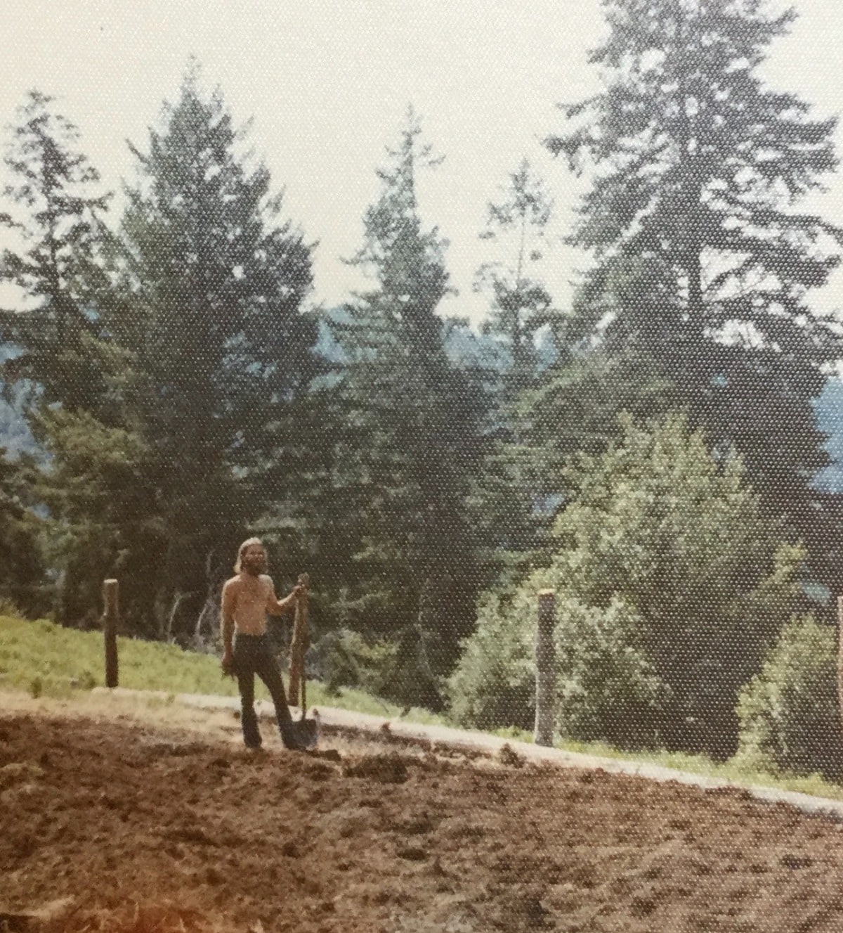 You can see the start of our house in the background. We have been gardening and building through all the years since this photo. Tom always finds time to create art in his own unique style.