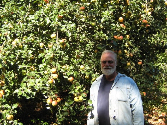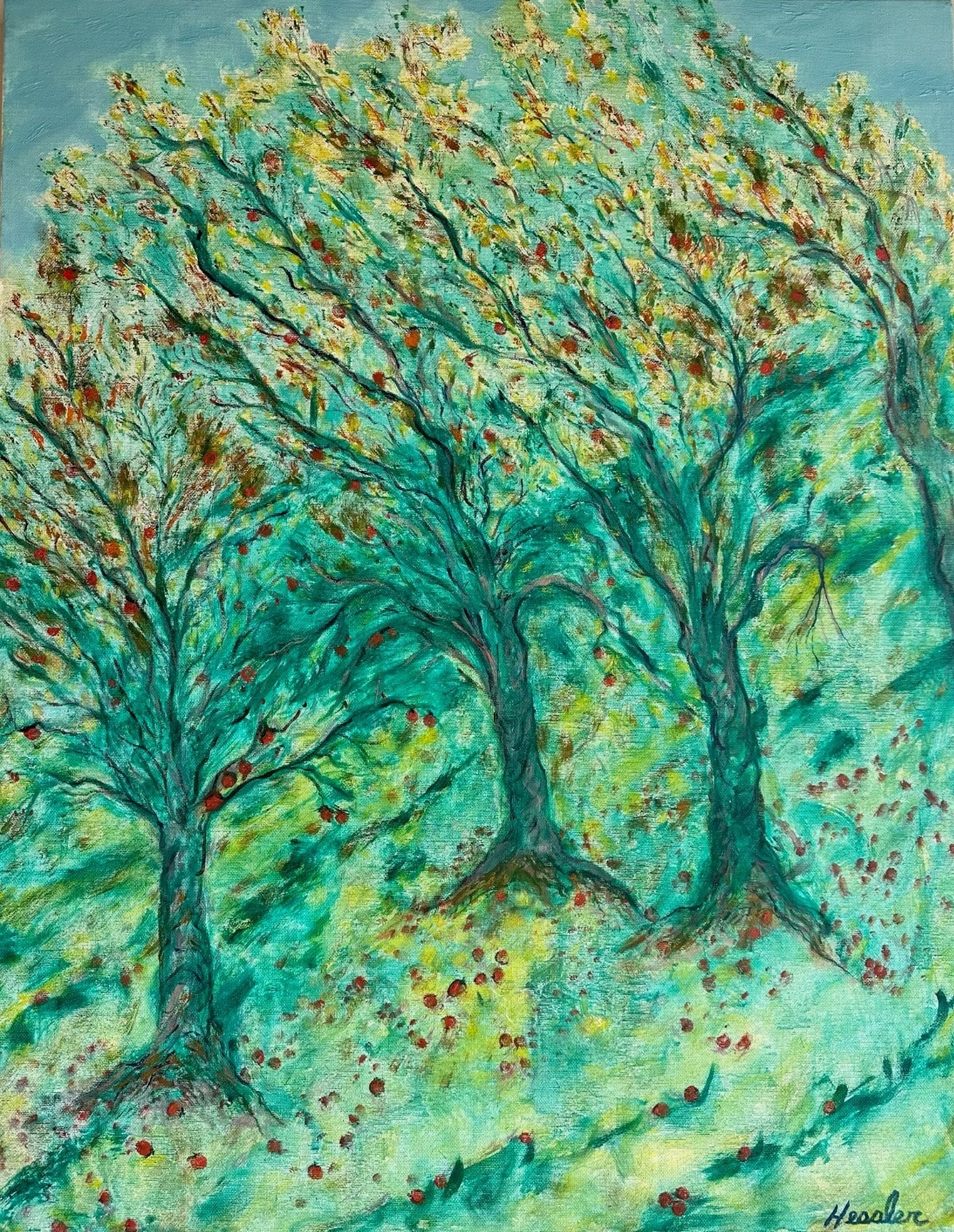 Our orchard is a collection of apple varieties that we have grown for over 50 years. Many of the varieties are apples developed by Albert Etter, a famous plant collector and hybridizer from the early 1900's. His experimental research and development farm is near us, and we were able to get cuttings from these unique trees from his descendant, Mike Etter. There is a photo of Mike and Tom "bench grafting" these cuttings onto rootstock, which became the trees that we still have today. The painting is of the apple trees that grow right outside of Tom's painting studio.